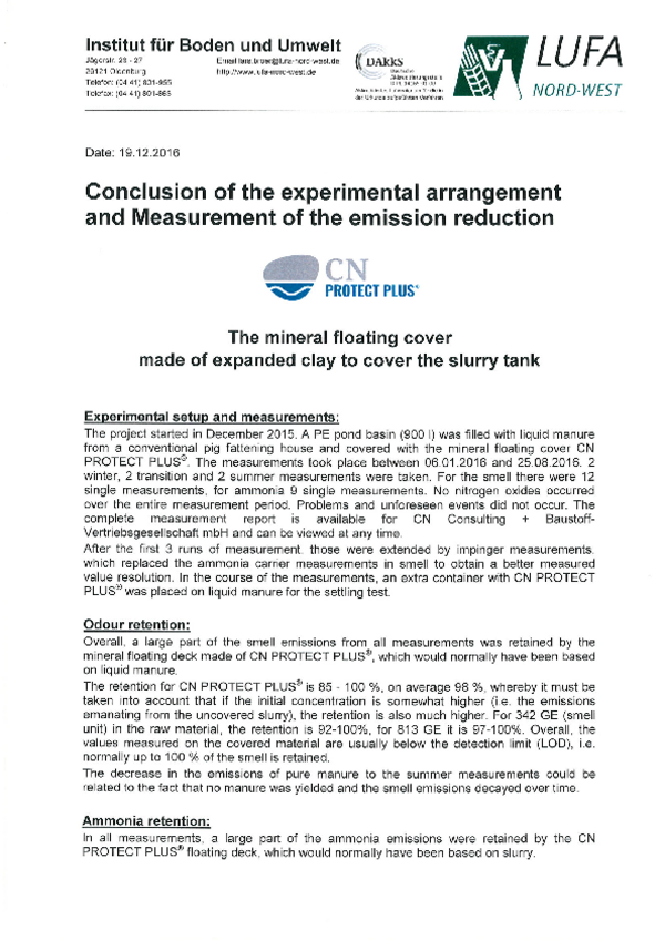 The test results of the accredited service laboratory for agricultural and environmental analysis LUFA NORD- WEST show exceptionally good emissions values in both areas with regard to the mineral floating cover. Where odour retention is concerned, a rate of retention within a range of 85 – 100 % results, however, with an average of 98%. Usually the measured values were below the limit of detection. The situation is similar where ammonia retention is concerned. The rate of retention fell within the range of 75 – 100%, but averaged 92%. You can download LUFA NORD-WEST’s conclusions here.